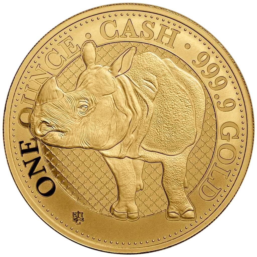 Vorderseite: Das Nashorn-Motiv wird durch die Aufschriften „ONE OUNCE“, „CASH“ und „999.9 GOLD“ stilvoll umrandet.